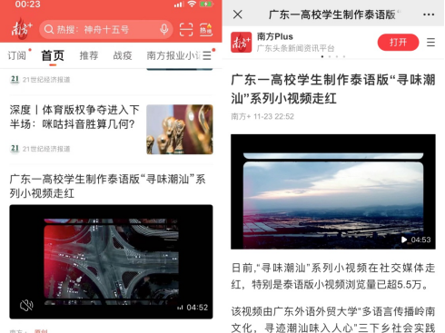 《寻味潮汕》小视频于2022年11月15日在泰国泰华传媒集团的中泰新闻网以及YouTube 和Facebook社交媒体平台进行了发布,新闻报道中不仅转发了完整视频,而且专门致谢伟德国际1949。目前该视频也被南方+、广东省侨联宣传文化中心、汕头市侨联和潮汕圈公众号报道转载。