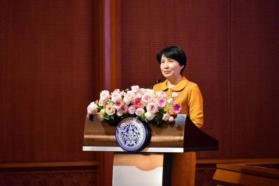 图为 2023年11月22 日在曼谷举行的泰国全球驻外使节经济会议上钟宝芬领事作为泰国投资委 BOI 驻外人员代表在会议上发言