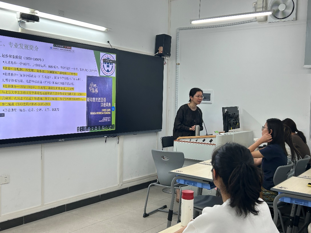 本网讯 11月8日晚,印尼语系举办题为“广外印尼语专业发展简介”的讲座,肖莉娴老师主讲,印尼语专业全体在校生参与,2022级学生正在印尼留学,线上参与讲座。