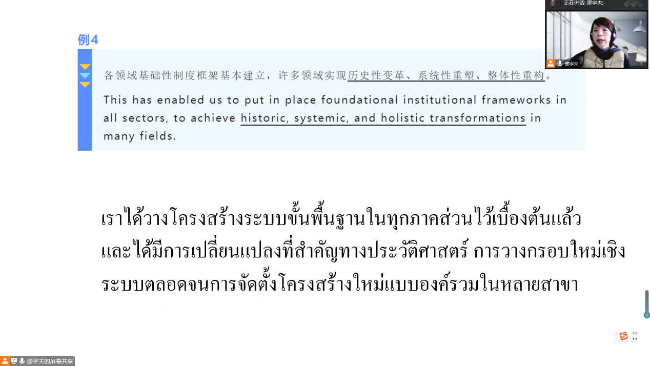 本网讯 2023年1月3日,泰语系对系内全体学生开展翻译实务提升专题培训,以线上会议形式进行。培训分别由唐旭阳老师、廖宇夫老师主持,两次专题培训围绕《习近平谈治国理政》的中泰翻译文本对照学习展开。