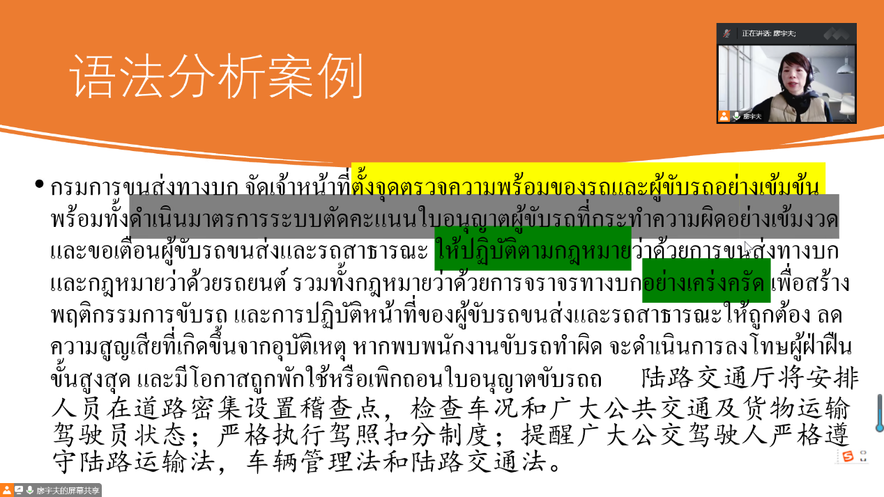 在了解了一些翻译策略后,廖宇夫老师还讲授了中泰翻译中具体的语法分析案例,泰语系学子也了解了泰语中动词的丰富搭配。