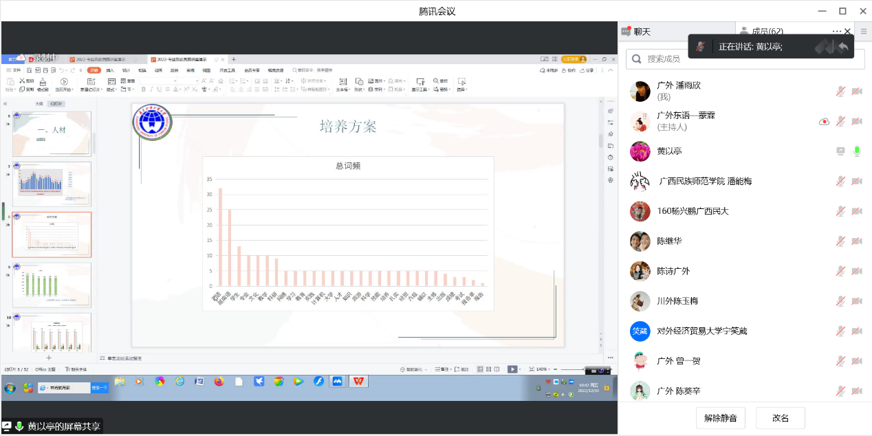 本网讯 2022年12月30日上午9:00,东语学院越南语系通过腾讯会议形式举行了以介绍越南语专业发展情况为主题的讲座,本次讲座邀请了对外经济贸易大学越南语系聂槟教授、广西民族大学越南语系黎巧萍教授、伟德国际1949越南语系黄以亭教授分别介绍本校越南语专业发展情况,并与来自全国几所高校的越南语专业师生进行交流。