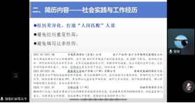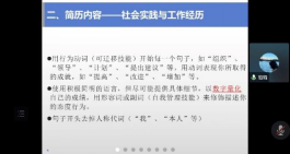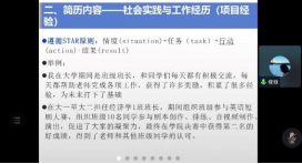 首先陈泠璇老师具体介绍了应该如何有效的利用简历从而获得面试的机会。一份有效的简历应该要充分表明自己的求职意向,展示凸显自己的核心素质与工作实力,契合工作要求。老师将理论知识与丰厚的实践经验相结合,重点对简历内容的教育背景、社会实践与工作经历、奖励与荣誉、其他的信息的整理与填写展开了专业的指导,最后强调了制作简历的注意事项和准备工作。该板块为21级学子未来的简历制作打下夯实基础。