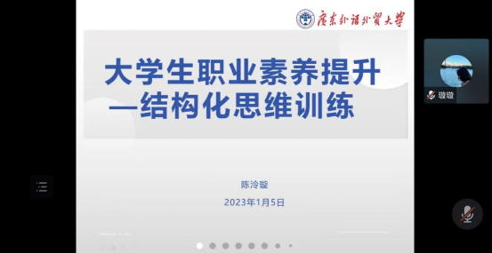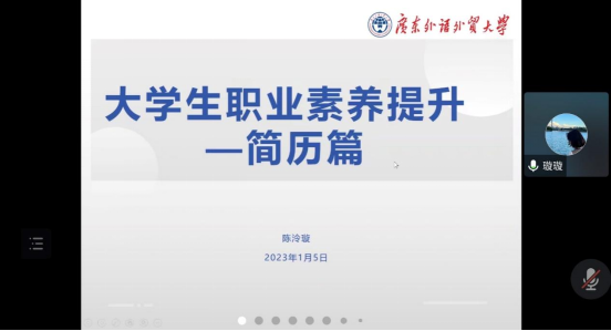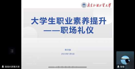 本网讯 2023年1月5日上午,为帮助东语学院2021级学子提前了解就业市场,完善自身职业规划,提升职业素养和求职技巧,辅导员陈泠璇老师通过线上开展了大学生就业指导课。2021级全体学子参加了课程学习。