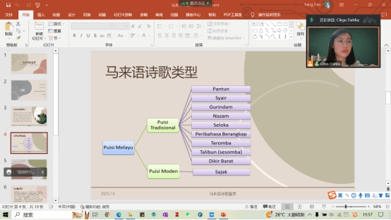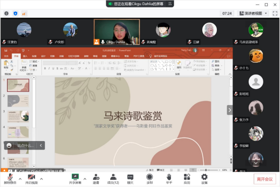 本网讯 2023年1月5日晚,为增进马来语系新生对马来文学的了解,培养新生对马来诗歌文学的浓厚兴趣,马来语系以线上形式举办了教学实践周系列活动之一——马来诗歌鉴赏会。会议由杨帆老师主持,马来语系2022级全体同学参会。