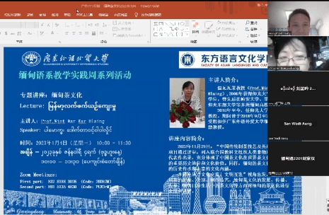 本网讯 2023年1月4日,缅甸语系举办教学实践周系列活动—“缅甸茶文化”主题讲座。讲座邀请缅甸语系外籍教授、仰光大学缅甸语系温瓦瓦莱(Prof.Wint War War Hlaing)教授为缅甸语专业全体师生讲授“缅甸茶文化”。讲座由张卫国老师主持,温瓦瓦莱教授主讲,缅甸语专业大四学生代表进行交替口译。